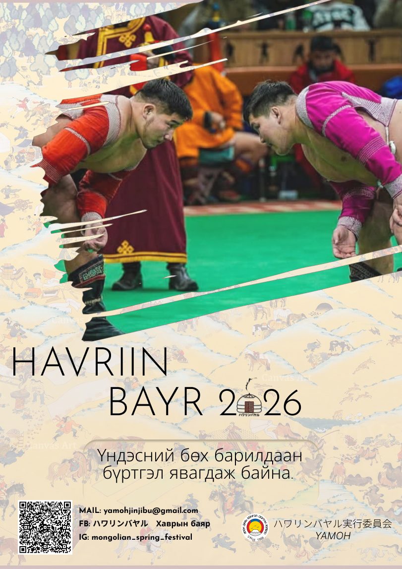 Монгол Үндэсний Бөхийн Барилдааны бүртгэл эхэллээ! “Хаврын баяр 2026”-ын хүрээнд зохион байгуулагдах Монгол Үндэсний Бөхийн барилдаанд та бүхнийг оролцохыг урьж байна. Монгол бөхийн барилдаан нь Монголын уламжлалт соёлыг Япон болон дэлхийн хүмүүст танилцуулах, мөн Япон Улсад амьдарч буй Монголчуудыг нэгтгэн хамтдаа сайхан цагийг өнгөрүүлэх зорилготойгоор жил бүр зохион байгуулагддаг. Монгол бөхийг сонирхдог хүн бүр оролцох боломжтой тул та бүхнийг идэвхтэй оролцохыг урьж байна!
